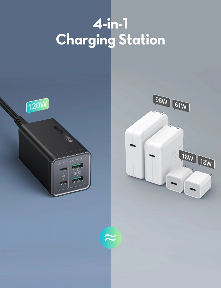 منصة شحن راف باور بقوة 120 واط بمنفذين USB ومنفذين تايب سي مع كيبل تايب سي تايب سي